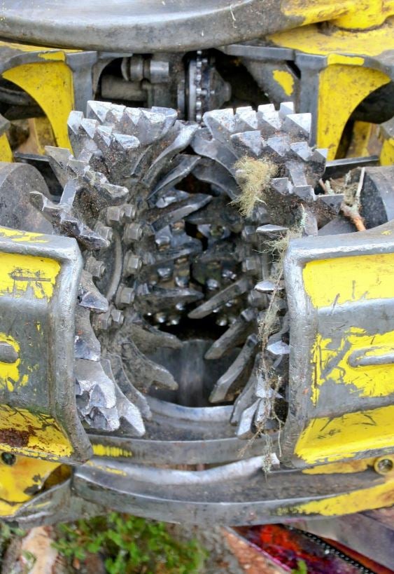 Den maskinerte gripeflaten på det skrå skaftet i akselens retning danner en sirkulær ytterflate som mater tømmeret jevnt. Kappelengden oppnås raskere, driften blir mer effektiv og lønnsomheten forbedres. Piggene på det skrå skaftet gir solid støtte for tømmeret. Matehjulene gir svært godt grep i begge materetninger, både bakover og forover. Grepet minimerer også overflateskader. Klemtrykket kan senkes, noe som også gir besparelser i drivstoffkostnader. Unikt utformede V-TEC matehjul John Deere H414/H424 har en åpen, lett og tilstoppingsfri konstruksjon. Hjulene er laget av hardt, slitesterkt stål, men likevel er vekten bare 23 kg.